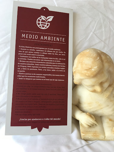 Read moreAlma Historica Hotel @almahistoricahotel @almahistorica probably is one of the best hotels in the old town (Ciudad Vieja). And most likely it's a hotel, where I would stay again if I needed to be in this neighborhood. However, there are existing problems with the housekeeping service and with the management of the hotel. I stay at this hotel many times and honestly nothing changes. They never change bed linens during the stay. The management states on a card placed by the bed that they change the bedsheets every odd day. I have stayed in the hotel for five days and the sheets have never been changed. This morning I especially left the card, which as well informs guest that if they prefer to have the linens changed, then place the card on the pillow, I neatly placed the card on the pillow. However, upon my return in the late afternoon to the hotel, the sheets were not changed with noticeable stains. It was obvious I should inform the hotel manager know about this ignored request. She [the hotel manager] said that the policy of the hotel is that the housekeeper checks how dirty the bedsheets are and decides whether its necessary to change them or not. Meanwhile, she is continuing telling, that regularly the bedsheets are changed after three nights. However, I repeat that for the fifth day of staying in that room the bedsheets never been changed. I try to explain to the manager that what she is saying now contradicts the rules that the hotel declares, which are clear described on the card (see pic). And such important requests of the guests, as the cleanliness of the bed, are ignored. This is nonsense. On provided pictures you can see the sheets with dirty yellow stains and the card which gives hopefulness to the guest that the guest is quality taking care by the boutique hotel. Since I spend time writing this review, I would like to note that for some reason there are not any glasses in the rooms where I stayed, meanwhile there is a mini bar with alcoholic and non-alcoholic drinks. And there is no laundry services and no laundry bags...