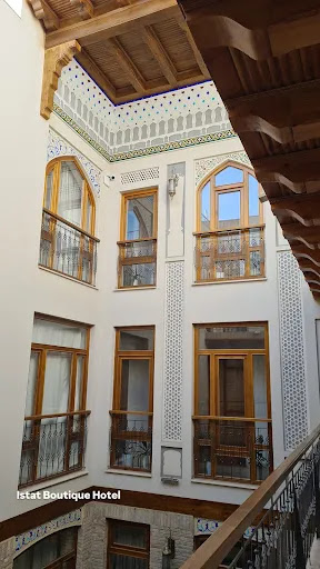 We booked a large double room for three nights. Given it is brand new, finding this hotel for taxi drivers seems to be an endeavor. It is true that the town offers an amazing amount of accommodations: hotels, boutique hotel and hostels are virtually everywhere. Istat’s location is very near to the Lyabi Khause Square, although a bit hidden in a neighborhood (near Amelia Hotel and Al Bukhari Hotel) which is undergoing quite a few constructions for, most probably, additional hotels. Upon arrival we were assigned room 304 on the first floor. The hotel offers accommodations on three levels: in the basement (where breakfast is served), on the ground floor and on the first floor. There is no elevator in the hotel. The property is built around a picturesque internal courtyard. Our room was quite large, air conditioned, nicely architected with precious wood carving, Turkish style mosaic lamps, sandstone walls in the bathroom which featured a telephone and a rain shower sets. The accommodation was clean and comfortable with minimal furniture consisting in a very large bed, two bedside tables, a wardrobe closet, a small fridge, a table and a chair. Complimentary water and tea was available in the room. The breakfast consists in a small but tasty selection of fruits, eggs, sausages, vegetables, pastry, yoghurt, juices, tea and coffee and is served between 08:00 and 10:00. Daily room cleaning has to be explicitly requested at the reception. All staff was kind but not everyone spoke english fluently. All in all a very positive experience. While in town we had dinner in Art Restaurant (near B. Naqshband 78) Minzifa (on Hoja Rushnogi 6) and Joy (on Sarafon 2) all within 5-10 min walk...