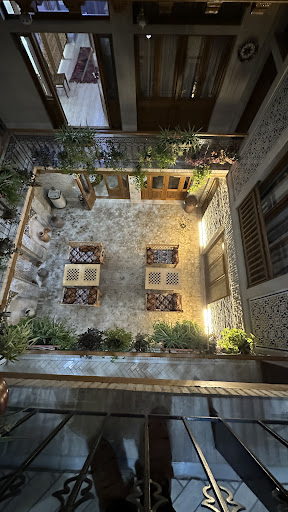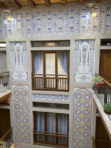 Situato nel quartiere ebraico di Bukhara, l'hotel pare proprio entrato in attività da poco tempo essendo nuovo di zecca. Camere rifinite con decori e dettagli in stile arabo, molto eleganti, dotate di tutto: frigo, tv, WiFi, cassaforte, bollitore, ben due mobiletti per le valigie, un grande lampadario luminosissimo al centro, un bellissimo, chiostro centrale con balconate interne, che può essere usato per relax e colazione. La nostra camera, la 301, spaziosissima, ha due letti singoli, molto ampi per una persona, e comodi. Cuscini invece troppo alti. Le tende non sono proprio oscuranti, quindi al mattino un po' di luce entra. Il bagno è molto ampio con sufficienti appigli e ripiani per asciugamani e teli, dotato di tutti i gadget necessari. Il campanello esterno forse risulta un po' forte come suono e si sente anche nelle camere (per quelle poche volte che viene usato) ma il silenzio è comunque apprezzabile. Colazione a buffet al piano seminterrato in connessione col chiostro, vi si trovano sia cose dolci che salate, anche se la sala colazione non mi è apparsa ampia e non ci si muove comodamente. Unico vero neo la mancanza di ascensore, ma il personale può sopperire senz'altro. Un esperienza gradevole a due passi dal...