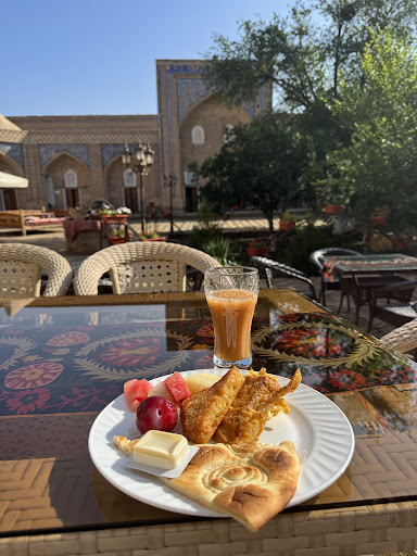 Read moreDavvero non credevo avremmo avuto la possibilità di soggiornare presso una madrasa, né, per la verità, che alcune di queste antiche strutture scolastiche 📖 islamiche fossero state convertite in alberghi, eppure, in tal senso, Khiva ha saputo sorprenderci 😮 non poco. Giunti in città direttamente dall'aeroporto di Urgench 🛬 (circa 45 minuti di percorrenza in auto 🚗), siamo stati condotti dal nostro autista/guida 🧑🏽 al Feruzkhan Hotel che, appunto, abbiamo scoperto essere stato ricavato all'interno della madrasa "Mohammed Rakhim Khan 1871" (stando alle informazioni che ho raccolto in rete 📱🌐 dovrebbe chiamarsi così poiché, a onor del vero, l'albergo sembrerebbe non avere un sito ufficiale). Veramente suggestivo il colpo d'occhio 👁 apprezzabile dalla corte interna sulla quale si affacciano tutte le strutture del complesso, dalla reception al bar/ristorante passando per le stanze degli ospiti. In breve c'è stata consegnata la chiave (o meglio, la scheda 💳) della camera (la n. 22) permettendoci così di lasciare i bagagli 🧳 e sistemarci in velocità (l'autista/guida 🧑🏽 ci stava infatti aspettando alla reception per iniziare la visita della città vecchia). La nostra permanenza in loco si è protratta sino al mattino successivo, quando, verso le 10.00 🕙, siamo ripartiti 🚗 alla volta di Bukhara, stavolta però con un nuovo autista 👨🏽. Non male le stanze, allestite proprio all'interno di quelli che un tempo erano i veri alloggi degli studenti 📖. Buona l'abitabilità, soprattutto del bagno 🚾 (peraltro munito di ampia vasca 🛁), mentre le finiture mi sono parse in generale un po' datate. I più alti devono avere l'accortezza di abbassare un po' la testa entrando e uscendo perché le porte 🚪 sono piccole (la struttura resta d'altronde quella originale della madrasa). Il Wi-Fi 🛜 è gratuito 🆓️ e funziona bene. Non straordinario l'assortimento a colazione ma comunque sufficiente per quelle che erano le nostre esigenze. Non conosco le tariffe poiché si trattava di una delle strutture comprese nel nostro pacchetto di viaggio, naturalmente già saldato con largo anticipo prima di partire. Strategica la posizione nel cuore di Itchan Kala (la città vecchia), dunque comodità assoluta per le visite del borgo. Esperienza unica e dunque...
