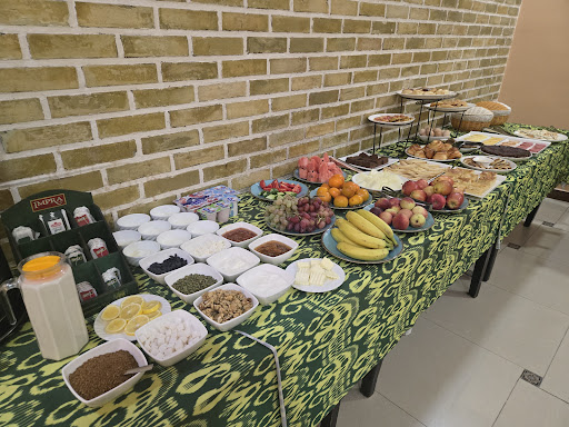 Excellent location only a 7-minute walk from the Savitsky Museum. (I highly recommend you go; although expensive for Uzbekistan at 95,000 soms, there is excellent modern art from Russian artists who immigrated to the country in the first half of the 20th century.) I stayed in room 214. Incredibly spacious. Comfortable temperature. Quiet. Good WiFi including for social uploads. Comfortable bed and the lovely big, thick pillows I’ve had in accommodations all over Uzbekistan. Outlets by the bed. No issue with hot water in the shower. Mini soaps and shampoo packets provided. Hotel recommended tour group to head to the shop graveyard outside Moynaq. Can pay by credit card. Buffet breakfast included and typically Eastern (tomatoes/fruit/lavash/samsa/ yogurt but you can ask for eggs to be made for you. First time I’ve had brown bread this trip and was excited!