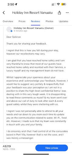 If youâre looking for a hospitality experience that redefines bias and neglect, look no further than IHG Vanuatu! Our stay from December 16 to December 19 started off decent until an earthquake struck. While the hotel staff worked tirelessly to manage the crisisâkudos to them for their genuine effortâour real issue began with the hotelâs General Manager, Rashmi, who deserves a special mention for her stellar display of favoritism.
