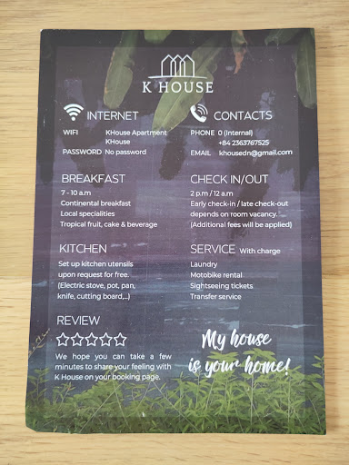 K House vs Apartment – 44 Lâm Hoành, Mỹ Khê, Đà Nẵng||We’ve stayed here a few times already, and each visit makes us fall in love with the place all over again. It’s small, but has such a unique and warm atmosphere. The location is just a little off the main road — very nice and peaceful! It’s quiet, though you may hear the neighborhood roosters crowing in the morning. We’ve gotten used to it, and honestly, it’s still much better than traffic noise.||One lovely detail is the little fish pond right by the sidewalk as you approach the front door — such a charming and relaxing welcome.||Just a one-minute walk brings you to the white sand beach, where the morning breeze, fresh air, sunrise, and the gentle mist of seawater with dew on your face make you feel like you’re walking on the sky.||The staff are excellent — always friendly, smiling, and ready to help. Even if you ask for something not on the list, they will do their best to make it happen, thoughtfully and beyond expectations. Many of the young staff are college students fluent in English, and they communicate with confidence, making everything easy and professional.||Breakfast is served at 7:00, simple but just enough — not a buffet with a hundred items like chain hotels, but always fresh, tasty, and filling. If you’d like something special, the chef will happily prepare it for you, treating you like family. At first, the personal approach felt a bit unusual, but we quickly grew to love the warm relationship between staff and guests. The food is always prepared with care and love, and if you’re a little late, it doesn’t matter.||The rooms are large and spotlessly clean. Housekeeping is available upon request at any time, and you’ll also find utensils and cookware if you’d like to prepare your own meal. Every day, a small care package is provided with bottled water, fresh towels, and toilet paper — such a thoughtful touch! Soft drinks, beer, and water are also available at very reasonable prices in a cool and roomy refrig. in the room provided from the hotel.||The pool is clean and well maintained. Of course, sometimes a leaf floats by, but everything is cleaned regularly. And every time we swam, the staff immediately offered towels.||We recommend this place without hesitation — it truly feels like a little home away from home!||Max...