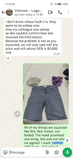 After I insisted to get the full refund, the woman from Saigon tried to insult me by saying that "it's not big money for the hotel", and that "I shouldn't make a problem for such a small amount of money". I explained that the reason why I want the money back was not because of the amount, but because the agreed service was not provided by the hotel and they failed to deliver. I added that because of that, instead of sleeping, now I have to try to fold all my laundry personally, not to talk about ironing. I also mentioned that they did the wrong calculation and overcharged me and I carefully explained to her why the calculation was wrong. She was extremely angry, but she eventually gave me the full refund back when she saw that I wouldn't quit.