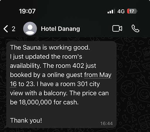 The Sekong Apartment is quite nice in a fairly good position. I originally booked a studio but was offered to upgrade to an apartment for around $300 more. On arrival the queried the room as it looked to me like a studio. I was then informed that they only have studios. So what was the upgrade ?||The sea view is between two hotels and the sea is about 200 metres from the apartment. The balcony is about 1 metre wide.||The kitchen was basic. One frypan, one pot, one colander, one kettle, two small cups, four bowls, of different sizes, two forks, two spoons, no knifes, except one small caving knife.and a small fridge. The sink had only cold water.||The TV was reasonable except there were no local channels, Netfix was logged in and was in some foreign language that I couldn't change. The only channel usable was Utube.||The couch was reasonably comfortable except it smelt of all the sweaty bodies that have sat on it before, The beds were comfortable.||The bathroom was fine and had everything required.||The other problem was it was directly opposite the Temple that plays very loud doof Doof music every night. The good thing was it usually finished just after 10.00pm||The girls on reception were very nice and tried to help where they could. There was a bit of a problem with communication though.||The pool was nice on the roof , the only problem was that during the day when you want to use it it was to hot. There is no shade so you can't lay by the pool or you would fry.||There is a small gym, it has a fan but no aircon. I don't know why you would want a sauna or steam room in Vietnam.||I was therefor 4 weeks so we know the good the bad...