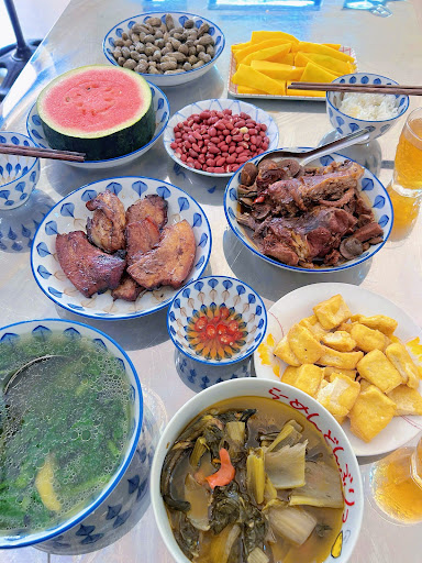 Bà mang gần như hết đồ trong tủ lạnh ra đãi bọn mình, từ trái cây đến đồ uống rồi cả mấy món ăn nhà nấu – phải nói là ngon cực kỳ, chuẩn vị cơm nhà, đậm đà và ấm áp lắm luôn. Ăn một bữa mà cảm giác như đang được bà ngoại nấu cho 🥹🍲