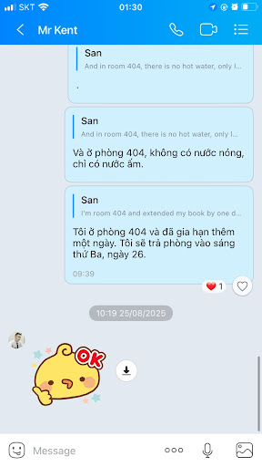 Day shift a hotel staff were very friendly and allowed me to check in about an hour early. I was impressed by the kindness of the hotel staff. Yet, I texted the hotel receptionist who night shifter that there was no hot water in room 404. He said, "Okay." But the hotel didn't take any action. So, I ended up showering in cold water for two...
