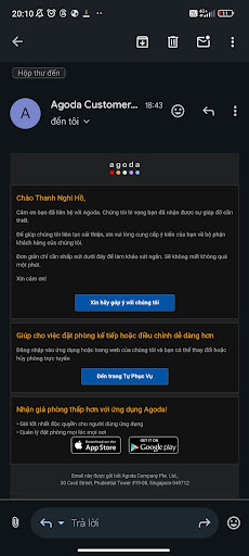 Sau khi trình bày rõ sự việc với bên CSKH của Agoda, thì tụi mình đã được giải quyết hủy phòng và hoàn tiền ngay lập tức. 100 điểm cho Agoda, 0 điểm cho Home.