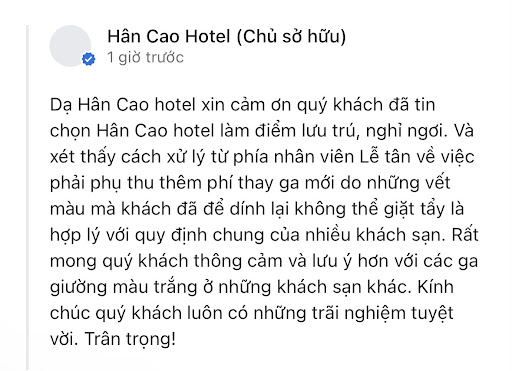 Việc để dính lại màu do đồ quần áo dính trên ga , thì không nói ( mà thường khách ở lại hơn 1 ngày thì những khách sạn khác phải thay ga mới-nhưng phần này e thấy KS mình không có ha, với do ở thêm có nữa ngày nên em không yêu cầu thay ga mới luôn). Em ở KS nhiều lần , lần nào cũng dọn vệ sinh phòng sơ qua mới trả, nên khi nói ga dơ em mới thắc mắc nhắn hỏi và yêu cầu chụp hình lại , thì nhân viên lại đòi thêm 300k nữa. Trong khi trước đó tiền phòng 700k thêm tiền ga dơ 100k (buồng phòng đã lên kiểm tra) , khách hỏi lại đòi thu thêm 300k nữa! Trong quá trình xử lý vấn đề không có một câu xin lỗi cho tới khi khách nhắc và nhưng câu trả lời thì như kiểu “ dạy đời “ nhắc nhở lần sau có ở khách sạn Hân Cao phải chú ý quần áo mặc đem...