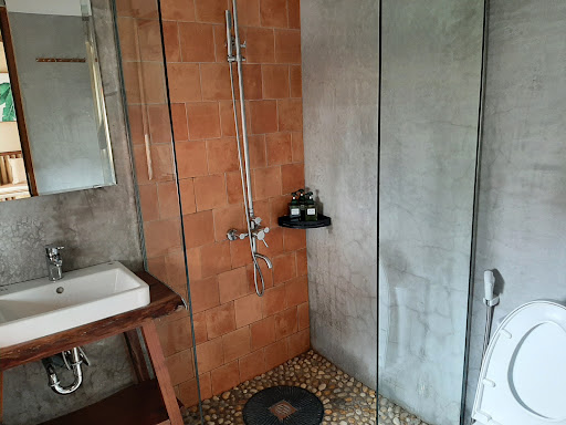 The homestay has a modern and warm feel, with many plants and wood features. There is a very elegant “hacienda” style garden in the center of the homestay. The AC and hot water worked great, and the room was clean and comfortable. There is a nice rain shower with good water pressure.