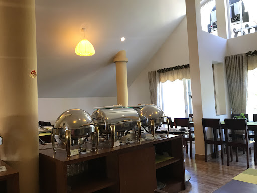 1 điểm dừng chân nghỉ ngơi khá lý tưởng, thái độ nhân viên khá là nhiệt tình, khách sạn có 3 tầng nổi (2 tầng phòng - tầng trên cùng là nhà hàng) - và có tầng chìm, nói tầng chìm thực chất vì xây ở sườn đồi, nên sẽ có tầng ở dưới dân đồi so với mặt đường. Nhưng các bạn yên tâm là các phòng khách sạn view chủ yếu ở cửa sổ sau, nên hầu như phòng nào cũng có view đẹp Những phòng ở hành lang trước sẽ có view ra phía mặt đường, so view thì sẽ không đẹp bằng view ở mặt sau. Phòng khá rộng và thoáng, sạch sẽ, do nằm cách trung tâm 1 khoảng vừa phải, nên không gian khá là yên tĩnh. Khách sạn có thang máy nên đi lại khá ok, nhưng vì giữa các tầng khoảng cách cũng không nhiều, nên mình khuyến khích các bạn nêu đi cầu thang bộ rèn luyện sức khỏe =))). Nói rèn luyện sức khỏe, khách sạn có trang bị 1 phòng gym thu nhỏ, với 1 máy tập đa di năng, nhưng nó thiếu khá nhiều tạ, nếu bạn nà tập gym khỏe, thì chắc cái này chỉ để khởi động thôi. Có 1 máy chạy, nhưng đợt mình đi thì bị hư mất, không biết giờ đã sửa chữa chưa. Tầng lễ tân, và sảnh chờ, có bàn ghế phục vụ khá chu đáo, có trà Atiso uống bao ngon. Và có 2 máy tính bàn kết nối internet để các bạn trong lúc chờ, cần check thêm thông tin hoặc làm gì đó,... À, khi nhận phòng các bạn sẽ nhận được phiếu ăn sáng free kèm theo, nhớ giữ chúng kỹ nhé, để dùng check thông tin vào bữa sáng hôm sau, bị mất là hơi phiền một chút để xác nhận thông tin. Bữa ăn khá đa dạng, từ ăn nhẹ cho đến ăn mặn đều có, thiếu gì, hay cần hỗ trợ gì các bạn có thể nhờ sự giúp đỡ của phục vụ, họ khá là nhiệt tình. Lưu ý 1 chút, là vào các ngày vắng khách, như có 1-2 phòng, khoảng dưới 10 khách, nhà hàng họ sẽ ko setup sẵn đồ ăn ra ngoài, mà mình cần phải order, họ sẽ làm...