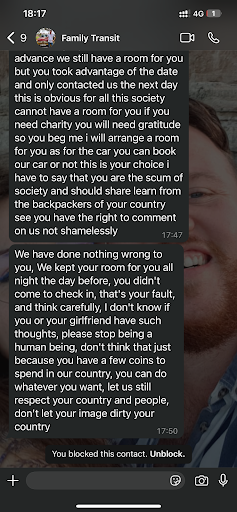 We have done nothing wrong to you, We kept your room for you all night the day before, you didn't come to check in, that's your fault, and think carefully, I don't know if you or your girlfriend have such thoughts, please stop being a human being, don't think that just because you have a few coins to spend in our country, you can do whatever you want, let us still respect your country and people, don't let your image dirty...