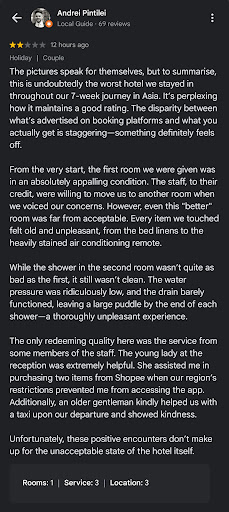 We urge potential guests to read through all reviews—particularly the negative ones—to get a fuller picture of what to expect. This is not meant to harm anyone’s business but to ensure that fellow travelers are not misled. Honest feedback should be met with genuine efforts to improve, not manipulation and...
