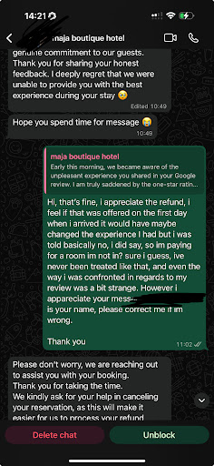 I left my first bad review, during the night i couldn’t sleep as you could hear everything, after i woke up late at 2pm, had a car booked as i had a pick up for 7, reception asked to speak to me and said after seeing my review they wanted to upgrade me, although i told them im leaving, what and how will that affect me? They then gave me a refund in cash for the one night, which although i was pleasantly surprised i was shocked, one bad review got me the 4* service i deserved? I was even messaged on whatsapp by another member of reception, in the morning and twice more after i left