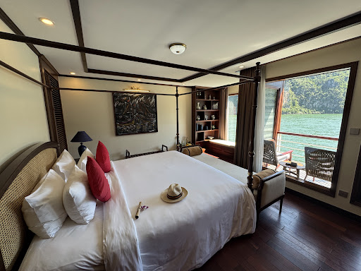 The team from Lux Cruises greeted us like royalty, green tea in hand, all smiles and precision. Even our cabin key was presented with a bow. The boat itself was stunning — polished wood, gleaming brass, and a balcony big enough to make you consider moving in permanently. Inside our suite was a four-poster bed, a huge bathtub facing the bay, and soft music playing in the background. Five-star serenity floating on jade-green water.