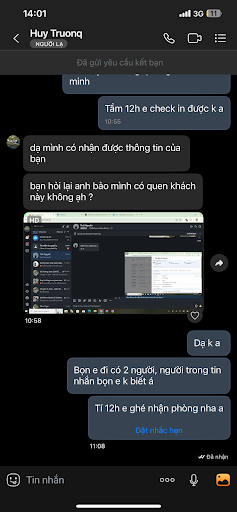 Read moreMình nhắn tin xin phòng check in sớm mới phát hiện có người lấy booking đi lừa đảo. Chuyện hấp dẫn hơn khi chủ còn k liên hệ với mình qua agoda để xác nhận lại có thật là mình đi chung với tên lừa đảo đó k hoặc đợi đến ngày mình check in hẳn làm việc sau. Tên lừa đảo nói rằng họ đi chung với mình và yêu cầu homstay phải xếp phòng gần nhau, tuy nhiên mùa cao điểm nên họ không có phòng gần nhau và homestay đồng ý hoàn tiền cho kẻ lừa đảo. Mình nhắn tin xin nhận phòng sớm mà chủ k rep thì mình cũng nghi ngờ, tới nơi mẹ của anh chủ mới nói giờ hoàn tiền cho mình tìm nơi khác, nhưng tìm đâu ra phòng với giá mình đã đặt trước lễ và phòng nào trống trong mùa lễ này???? Mình cho 3 sao vì mẹ của anh chủ hỗ trợ tụi mình hết khả năng để tìm chỗ cho mình ở. Cô cũng rất niềm nở. Còn cách làm việc của anh chủ thì nên xem lại. Mình cũng làm trong ngành khách sạn nên thấy cách anh ấy làm việc thiếu chuyên nghiệp Note: người trong ảnh mình k hề quen biết và nếu ai bị trường hợp như mình thì cẩn thận. Tin nhắn này là anh chủ gửi mình khi anh trao đổi với kẻ lừa đảo