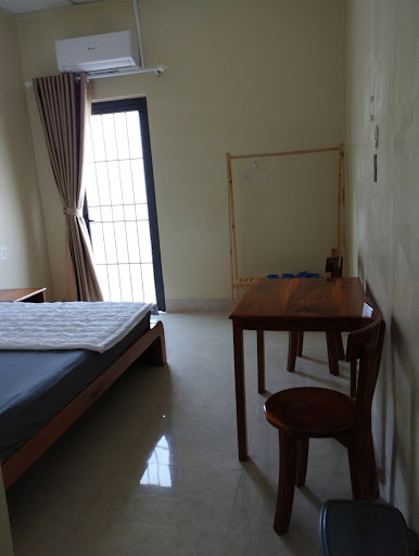Phòng: sạch sẽ, đơn giản gồm 2 giường, 1 tủ nhỏ giữa 2 giường, 1 kệ gỗ treo quần áo, 1 bàn 2 ghế, thùng rác, 2 đôi dép trong phòng,1 đôi dép trong toilet. 1 Máy lạnh tốt và 1 quạt treo tường Không có: Ti vi, nước suối, máy sấy, bình đun siêu tốc, ly thuỷ tinh …