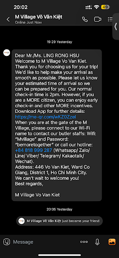 Read moreThis hotel just open 1 week ago & it's under the M Village management (I used to stayed in the M Village - Pham Ngu Lao branch too)From Bui Vien street to reach here was around 1,5 KM by walk, the room & the facilities inside of it was quite completed (even provide the sofa, freezer, hair dryer, iron) the laundry at the Ground floor also can use by own (just like my experience I met when travelled in China)At the 5th floor also have the rooftop garden (hope open it soon)The door's room was the new design & can insert the code (hope upgrade it in the future) so can say the security is very well maintained.Thanks to the receptionist under the name "Alice Tran" who's really professional of her all services (she also find my nail clipper & contact me directly) really...