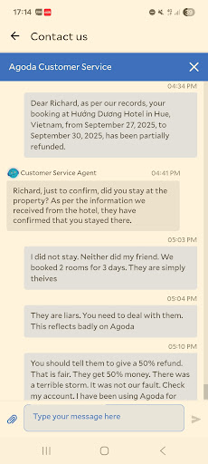 Read moreI woke up to a heavy storm in Da Nang and travel warnings not to travel. It was worse in Hue where this hotel is. At 10am I tried to cancel and at least get a 50% refund. This hotel knew the weather warnings but was not interested. I told the hotel we will stay after the storm. They have kept the price of 2 rooms for 3 days. Free money for them. Nice little earner. They even lied to Agoda and said we had stayed at the hotel. Thieves and liars. Disgusting behaviour. See the...