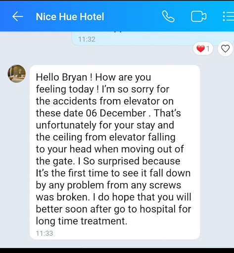 To this day I still get random headaches and have bad neck problems. But Quan hasn't offered any monetary assistance. Nothing. Not a single Vietnamese dong of help even though his hotel has injured me. Even though he acknowledges it in the attached text message.