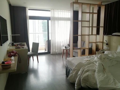 Очень хорошее расположение отеля возможно главный плюс заведения. В остальном все более менее посредственно, есть свои минусы, но жить можно. Порадовал спортзал и бассейн на верхних этажах отеля. Но! от спортзала постоянно шум ,так что кто решил спрятаться от уличного шума в верхних номерах, прогадал дважды. Во первых как я уже упомянул , отель расположень в очень тихом и укромном уголке центральных районов, где после 9 вечера уже тишина , и слышно сверчков (чего не скажешь о центре, буквально в пару минутах ходьбы, там в этом время только все оживает ) а во-вторых - как раз таки бассейн на крыше с его лаундж баром, то место где все собиратся после 21:00. Так что где то средние этажи ( а их в отеле кажется 17) подойдут лучше всего. О плюсах отеля : вкусные завтраки,качественная уборка,белоснежная постель,приветливый персонал,хороший прайс за свои звезды,наличия спортзала и бассейна. Минусы : с вами всегда в номере будут не очень приятные гости ( тараканы ) !! как бы не просили их истравить ,ничего не получалось , их немного ,и они не всегда на виду, но все же не очень приятно утро начинать ни с кофе а с приветствием этих "соседей" ( хотя привыкаешь , и уже потом не обращаешь внимания.) и еще персонал приветлив конечно, но вот с изучением языков - не очень, о русском забудьте, а английский на уровне жестов и самых простых слов. Но в целом, если постоянно не находится в отеле, то более чем хорошее место. Вблизи отеля очень много кафешек и ресторанов, от кафешек с местной кухней, где покушать будет стоить копейки ,до ресторанов разной кухни с уже более высоким прайсом. Из запоминающихся запомнились : Армения ( она сразу в переулке напротив отеля ) что касаемо нашей кухни - это самый вкусный ресторан. Так же очень понравился итальнский ресторан и по совместительству стейк хаус - Маринелли бистромния (в конце третьей линии, напротив аптек.) Необычный интерьер, вежливый и профессиональный персонал. Шеф повар работал в Италии, общались лично, приятный мужчина. Очень понравилась пицца с лососем ,что то необычное , и на пиццу не похоже, больше похоже на блюдо из морепродуктов на сочном кусочке теста . Ну а любителям "Турции" и "шведских столов" заведение Гриль гарден - платишь 650 местных денег , и кушаешь сколько угодно. Идеально подходит для пробы разных видов мяса в один вечер ) Пляж находится от отеля в пешей доступности, просто не теряйтесь , и уделите 10 минут своего времени,чтобы разобраться как устроены линии, и где из них первая,где вторая ,где третья) наши знакомые умудрялись на пляж идти через центр и таким образом наматывали неплохой такой лишний кружок ) Чтобы выйти на пляж! Нужно для начала попасть на первую линию! перейти центральную дорогу ( будьте аккуратны и забудьте о всяких правилах ) и вы попадете на набережную ! Ориентиром может быть здание розового цвета Лотос ! , если вы его видите , значит вы на правильном пути ) выходя с отеля ,просто поверните направо и идите прямо около 300 метров, и вы попадете на пляяж ) Из запоминающихся поездок, которые можно смело советовать это - водопады Бахо и поездка в Далат ! это стоит потраченного времени и денег!Во Вьетнаме второй раз, в сравнении с заезженным Таем , в особенности Патаей. Тут намного чище и народ добрее. Отдыхом...