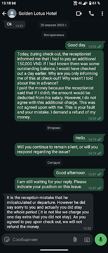 The pros of this hotel are only the low cost and the fact that it is very close to the sea. ||Now about the minuses! ||I have not seen anywhere but this hotel such an attitude of the staff. Although I traveled all over Vietnam and stayed many places ! In this hotel I stayed twice in February and January for over a month and then in February for two weeks ! The first time only general observations: the lobby is always crowded with motorcycles so that it is impossible to pass in the evening. The pool is constantly dirty and filled with garbage, the water smells, from the shower water goes jerky: To hot or cold, it may not be the pressure of water and barely drips, audibility: you can hear all the conversations in the corridor and behind the wall. You can hear when a chair is moved above your head - it's a terrible sound. I can hear the neighbors having sex. Hearing when the neighbor across the hall listens to music all night with two fun girls. He lived with the door open and all night the hotel security did not act or try to calm him down. I had to do it myself to keep him quiet at night, we have a small child. ||Wi-fi works just disgusting. Internet practically does not work. The glass carafe in the water is poured from some plastic bottles it is unclear where they get it from: there is a feeling that dial from the tap.||||The public areas are filthy. Around the pool is filthy. The siding board on the floor on the loggia in the cracks and not even, repeatedly beat their fingers to blood, and hurt about the protrusions on the board with broken corners in these holes fall through things. Windows have never been washed, muddy and dirty. On the deck chairs splinters and chips. Bedding for sunbeds torn and smells - they have never been washed. The laundry is slow and of poor quality. Do not use the dry cleaning in the hotel they do not wash, can forget to return, and do it slowly! All the time in one of the rooms make repairs, you can not sleep because of the sound of sandpaper. And the main thing white dust and dirt from the repair in the corridor and throughout the hotel. It was like that for two months. And the windows overlook the farm where roosters scream all night. It's unbearable. Huge iron cart cleaner all the time stands in the corridor occupied space opposite the elevator - it is at least not aesthetically pleasing.||||I had no complaints about the cleaning, although my friends staying in the same hotel told me that they cleaned badly. I noticed this only after staying in this hotel for the second time. ||It so happened that in other hotels there were no places during the Eastern New Year. So we had to go back to the same hotel. Do not take these employees at their word they do not keep their promises. ||We agreed with the girl from the reception about our arrival. Confirmed the date and arrived. We observed all the rules of courtesy and etiquette: we patiently waited for 2 hours of the day for check-in. We did not bother anyone, although we actually arrived in the city at 6 am. Although that girl, a hotel employee, in the morning we wrote that if the room will be released earlier that we would be informed. But our request was ignored. Did not inform us about any changes. At 2 pm check-in time I came smiling and in a great mood. And the girl at the reception was surprised and said that the hotel is full. And everything is occupied for three days in advance. And there's no reservation in my name. And rooms will be only in three days. We started to find out the details and I had to show her correspondence with her colleague. Her colleague didn't pick up the phone and didn't reply to my messages. As it turned out later: she simply forgot to put me in the reservation, probably distracted by something and by her own negligence forgot to reserve a room for us. That's why she didn't answer messages to me or pick up the phone from her coworkers. She must have been scared.||||History application for the next day.||Eventually this coworker finally showed up at work. And when I approached her and showed her the correspondence, she started waving her hands at me in a boorish manner, shouting and shouting at me, chasing me away with gestures, although I didn't say a single bad word to her and kept smiling, somehow, that's what politeness requires. This woman rudely refused her words began to deny everything looking into my eyes, shouting, and gesticulating insolently. I offered her not to create conflicts and just find us a hotel nearby at the same price as compensation for her mistake. She keeps yelling that she won't look for anything. She says go away. On the words that it is her mistake and not mine, the employee also reacted inadequately. She did not even want to call the manager and superiors. I found the manager's number myself on a business card. I contacted the managers and told them the problem. They didn't answer right away either. I sat on a bench near the hotel for about an hour, tired, sleepless, hungry, and without a place to stay. When the manager answered, she started to defend her employees. But she said I could book for tomorrow. But I didn't book through the cashier's office. I don't trust them anymore. I made a reservation through another site, which an hour ago there were no rooms for tomorrow. The whole town was full during the holiday. So there was a room, but the manager unlocked it. She promised to find a place, but she didn't. I looked for accommodation for the night myself and wandered the streets until the evening. ||||The next day I checked into the hotel. But the disgusting attitude on the part of the staff started. For two weeks they never cleaned the room. They never changed the water. When I asked to change my linen, they put a dirty blanket and pillowcases. When I told about it - but in general they put a blanket with a brown stain for the second time, as if someone used it in the toilet instead of paper. Photo attached. The pool was dirty all the time. On the