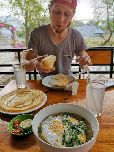 This place is so beautiful and you have a great view of the rice fields and karstic mountains right next to you. The owner and his family are so lovely, kind and hardworking. They also have a great menu with delicious food (also beers to enjoy the sunset). Everything was super clean, they ask you daily if you need the room to be cleaned. Free water and free breakfast everyday (don't miss the banana pancakes!). I highly recommend you stay here if you visit Ninh Binh and want a lovely and quiet place with a great view, you can also rent a motorbike or bicycle so you can get closer to the popular places (up to 17 min of distance to Tam Coc) or even walk beside the rice fields for about 40 minutes! Oh and also, they have a very cute and friendly dog.