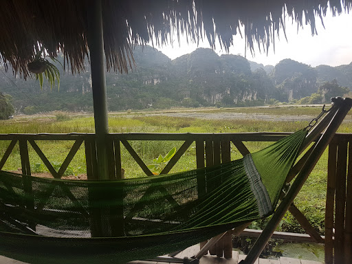 We arrived at sunset, the golden glow accentuating the beautiful panorama. Getting there was a bit of an adventure but one well worth it. We rented a motorbike and the last bit is on a small rocky road they made special to access the homestay. For those not comfortable riding for themselves your hosts can pick you up. The homestay is held by two lovely sisters that decided to leave the city to come live in this haven of peace. In the main bungalow/building they keep a restaurant, the girls (and husband!) cook some delicious meals, I recommend the coconut chicken and tamarind beef. They have free WIFI. There are only a handful of bungalows and two rooms so it stays nice and quiet. We stayed one night in a room and one in a bungalow. The room is very decent, the bathroom shared and they have hammocks outside for some extensive stargazing. The bungalow is well worth paying extra. The bungalows are well built and you have the possibility to privatize your terrace so you can relax without the view of others. Unfortunately for us it started raining heavily after a boat ride at the Van Long nature reserve so we headed back, where we enjoyed Ninh Binh's beauty but on a sheltered bungalow terrace at the...