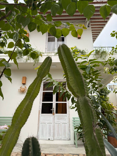 The house itself is lovely – clean, simple, and full of character. I really liked the white walls, vintage wooden doors, and soft green benches. Even the little details, like the cactus and wall decorations, made the space feel warm and welcoming.