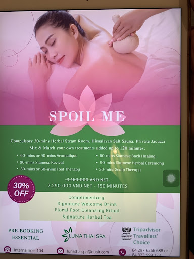Read moreMy recent visit to the Luna Thai Spa at the Dusit Princess Moonrise Beach Resort in Phu Quoc was nothing short of spectacular. This isn't just a spa; it's a comprehensive wellness sanctuary that prioritizes your relaxation and rejuvenation.From the moment I stepped in, the service was impeccable. The spa manager, hailing from Thailand, quickly recognized our shared nationality and went above and beyond to recommend a highly experienced massage therapist. This personalized touch made the experience even more special.The massage therapist possessed a wealth of experience and skill that was evident throughout the session. Their technique was exceptional, effectively alleviating my muscle soreness and tension. It was one of the most therapeutic and relaxing massages I've ever had.But the Luna Thai Spa offers more than just massages. The facility includes a sauna and jacuzzi, adding to the overall wellness experience. These amenities complement the massage beautifully, providing a full spectrum of relaxation and health benefits.If you're looking to unwind and treat yourself to a day of pampering, Luna Thai Spa at Dusit Princess Moonrise Beach Resort is the perfect getaway. Whether it's the high-quality service, the skilled massage therapists, or the additional wellness amenities, this spa ensures a memorable and rejuvenating experience.Highly recommended for anyone visiting Phu Quoc and looking for an escape into wellness and...