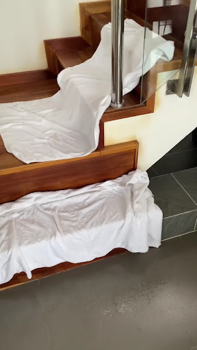 Day 4 it’s a rainy day, water began pouring in from the 4th floor down to the ground level. The villa manager clearly knew about the water leakage—he panicked when it started raining and urgently told us to close all windows and doors. This proves deliberate negligence: they rented out the villa despite knowing it was unfit for rain. This wasn’t just a drip; it was like indoors raining, requiring 3-4 towels per floor to soak up the water.