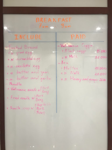 I came here cause it was the only hostel in the ”HostelWorld” platform and because apparently was cheap (4AUD = 63.000VND). I called the day before for reserve my bed in a dorm and when I checked in I had to pay 120.000VND “cause breakfast is included”. It was 6 AM and I didn’t want to argue. The hostel is a little bit far from the city centre but still in a good position, with a couple of supermarkets on the other side of the bridge. My dorm was nice and clean but no curtains for privacy, no safety deposit boxes and a private bathroom to share in 6 guests. Breakfast was nothing special. You can choose between Bread and eggs, bread with butter and jam or Vietnamese noodles soups. Don’t worth it and overpriced.