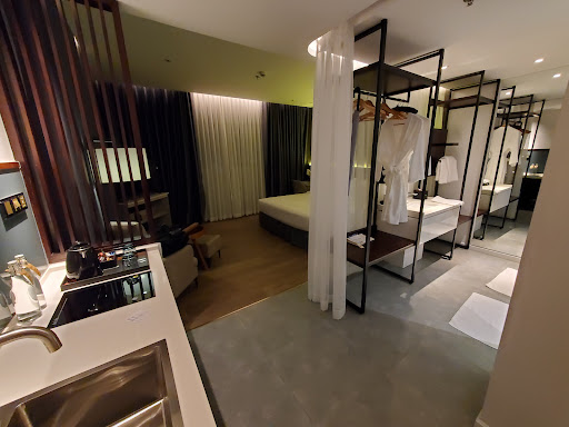 Read moreClean modern hotel with a comfortable bed. Agoda listed our room as a one bedroom apartment. In fact, it is a single hotel room with a kitchen sink, an electric hotplate, a wok but no crockery, cutlery, or kitchen utensils. The bedroom is not separate. There is no bathroom wall dividing the bathroom sink from the bedroom and kitchen sink, but rather a sheer curtain. This trending hotel design may not provide the required privacy for guests who are not a couple. The toilet and shower are enclosed in individual frosted glass cubicles opposite the bathroom sink but behind the sheer curtain. The are no drawers in the room for clothes storage only a steel frame for hanging clothes and an open steel shelf below it. Our first room 402 was too close to the elevator and too noisy. At our request we were moved to 408 at the far end of the public hallway. It was much quieter. The staff are friendly and accommodating. We ate dinner in the restaurant once and it was delicious. The prices were reasonable. We recommend this hotel and restaurant they are good...