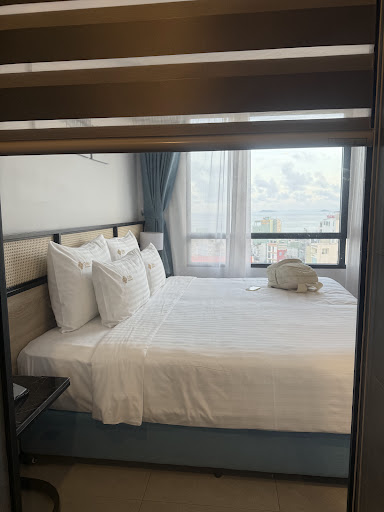 Our stay was wonderful and we ended up staying for around 3 weeks. The hotel is new and its setup is so professional. Unlike the other hotels in the city, they really go the extra mile to take care of their guests and make you feel at home. The rooms are spacious, clean and well airconditioned. The bed is also huge and comfy, and the shower is powerful with an additional massage setting which we enjoyed. The views of the sea were gorgeous, especially on stormy nights :) We had breakfast every day which included a combination of western and local options. The omelette and pho were particulary great! You can also order room service. They have smart TVs, so you can hook it up to your laptop.