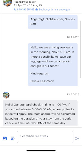 Bei dem Foto kann man sehen, dass wir dem Hotel geschrieben haben, keine Antwort erhielten und uns die extra Kosten für den early Check In am Abreisetag mitgeteilt worden sind. Wir blieben dort 10. - 13. April.