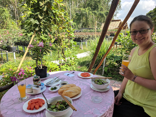 We came based on recommendation without any booking. We negotiated the price to just $15/night. The owner was super nice, he gave us snacks and a bottle of local schnaps for free. Bamboo hut was clean, comfortable and a great experience. The flowers outside are just beautiful. Every day they gave us large home cooked breakfast, we didn't need lunch after that :-) They rented us motorbike for just 100k a day and recommended places to go. At the end they booked us a bus to Saigon and took us to the bus station. The only downside was rusty English of the owner and mosquitos outside. Bring a repellent (at night you are under a mosquito net). Really a wonderful experience and full service, can't...