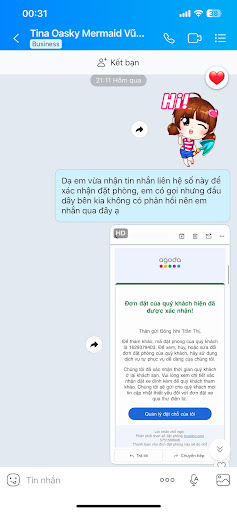 Read moreGia đình báo gấp nên mình tìm đặt phòng từ agoda xong từ 4h rưỡi chiều, nhắn thì không rep, 21h tối nhắn kêu mình liên hệ sđt để xác nhận phòng, mình gọi thì không nghe, tới lần 2 bên đó bắt máy thì kêu nhắn tin gửi mã đặt phòng mình mới báo là e có nhắn từ lúc nhận tin rồi bên mình check tn giúp e nhé, bạn ok, rồi tới 12h khuya mới nhắn mình báo hết phòng : ) trãi nghiệm tuyệt...