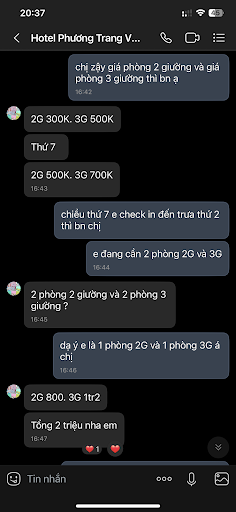 Read moreMình ở trong ksan Phương Trang này 2 đêm, ||Khách sạn vừa được sơn lại nhưng rất dơ, mọi thứ đều moi tiền khách||Khăn trãi giường cảm giác là 1 tháng mới thay 1 lần, vì còn bụi,||Phòng thì ko có ly uống nước cũng như ko có ghế ngồi, không có nước suối luôn.||Giá cuối tuần thì vẫn giống những ksan khác chứ ko phải rẽ hơn.||Khi mình trả phòng xin để đồ dưới sảnh nhà khoảng hơn 1 tiếng để chờ xe đến thì tính phụ thu thêm 50k????||Còn sảnh ko có ghế chờ cho khách nhận hay trả phòng ngồi, cảm giác làm ăn rất k được ,||mọi người không nên đến đây dù 1 lần. Vì ông xã mình thuê đã buộc đặt tiền hết cho 2 đêm lưu trú trước khi nhận phòng nên mình k thể...