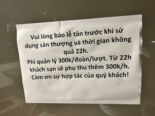 Read moreLần đầu tiên thấy cái khách sạn như bùi sân thượng cũng thu phí, trong khi đó bên mình thấy tờ giấy gián trên cửa sân thượng và thấy không hợp lý, và chạy xuống hỏi thằng cu lễ tân nó bảo cứ thoải mái đi anh. Xong ngồi gần 2 tiếng cái thằng chủ điện nói nhóm mình gây ồn ào trong khi đó phòng thì cách âm mà kêu gây ra nhiều tiếng ồn, trong khi đó chỉ ăn uống nói chuyện bình thường không hát hò mà bảo ảnh hưởng khách dưới phòng, khách sạn mà làm phục vụ như kiểu ăn cướp tiền của khách thì chịu rồi, kiểu này chỉ điên mới quay...
