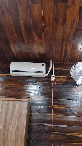 The rooms were very clean, spacious, and well-equipped with air conditioning and a hairdryer. The bathroom was also spotless with hot water. The view from the room was very peaceful, with lush greenery and a charming little bridge over to the bungalows.