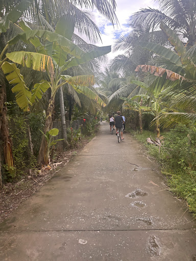 One of the highlights of our stay was the boat tour on the Mekong River, which lasted over four hours and was priced very reasonably. During the tour, we made several stops where we learned about local crafts and traditions. We saw how mattresses are made from bamboo, observed the brick-making process, and even got to taste some delicious local chocolates and coconut candies. We also learned about the various uses of different parts of the coconut, which was fascinating. The tour included tasting some local chocolates and enjoying a fresh coconut drink. We then biked back through the picturesque villages on the island, which was a delightful way to see the local scenery up close.