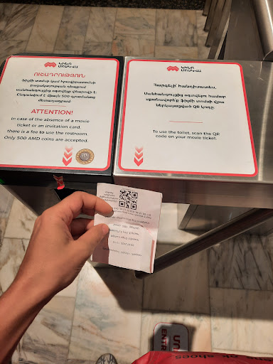 մարդիկ էլ կան, որ կենտրոնում անգամ պետքարան մտնելու գումար չունեն 100 դրամ, ու շատ հիվանդ մարդիկ կան, որ չեն կարող պահել մինչև տուն կամ պետք է լվացվեն, կամ վատացել են, քթից արնահոսում է, բա դուք էդ շենքը ժամանակին կոպեկներով պետությունից վերցրել, լավագույն տեղը զբաղեցրել ու անգամ մի գրամ խիղճ չե՞ք պահել կարիքավորների համար, տոմսը առնեն կեղտոտեն ձեռքները մարդիկ ու արգելվում ա լվացե՞լ։ Դե լավ է, էս ի՞նչ խելոք եք մտածել յոթանասուն տարվա մեջ։ Ամո'թ։ Պրծավ ձեր մոտ գալը։ Կամ ինչի էդ ո՞վ ա տեղյակ էս լկտիությունից, տեղեկատվական թերթեր տալի՞ս եք այցելուներին մինչև տոմս գնելը։ Այսինքն ապօրինի գործունեություն եք իրականացնում դուք տվյալ պահին, տոմսի արժեքի մեջ մտնում ա կինոթատրոնի հասարակական տարածքներից օգտվելը, եթե Ձեր զուգարանը առանձին բիզնես եք սարքել, պարտավոր եք զգուշացնել, այլապես անօրինական է, եթե ես իմանայի, կոնկրոտ տոմս չէի էլ գնի, 1500 դրամ տալիս եմ մի ժամ աթոռին նստելու֊գնալու, լավ դուք... Read moreLocated in the Charles Aznavour square, I was initially confused when walking in as there was a bar, an entrance to a hotel and a bank but I quickly realized that the theater is upstairs.