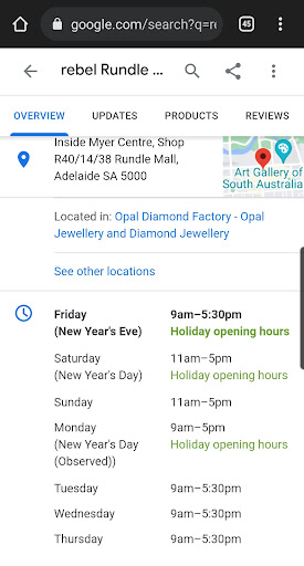 Read moreI would like to thank a young lady who works in this store for her kindness and compassion. My wife and I were having breakfast in McDonalds Rundle Mall today, when I was talking to a homeless lady who was in Maccas. I asked if she would like to breakfast, she said, know asked if I knew where she could buy a beanie. She advised me that the nights have been getting cold. I decided to assist her in obtaining the beanie. I went into Rebel Rundle Mall and spoke with a young blonde lady, (I'm very sorry, that I didn't get your name). This person went out of her way to find me a beanie. I gave the beanie to the homeless lady and she was very grateful to Rebel. So thank you, for the kindness and willingness to help. The people I spoke to this morning were a credit to your store, these gestures to people down on their luck have a greater impact...