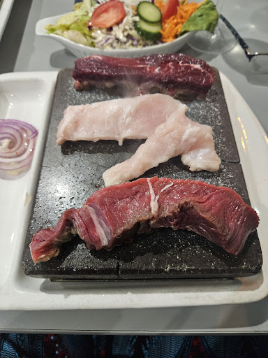 I’m not sure if we were here on the wrong day...but we did NOT have a similar experience to many of the other reviewers here. Apart from being overpriced and the establishment very tired, the steak experience can best be described as gimmicky. Although there was only 3 tables present when we visited, service moved at a glacial pace. They bring you a tiny tiny ramekins of watered down side sauce for your giant piece of meat...which for the record where nice cuts. The biggest elephant in the room is that the hot stone cooking, although ‘cool’ for a brief moment doesn’t allow you to get a consistent cook on your steak..your presented meat that has been seared on one side and then you shave and DIY cook small pieces that pretty much always end up well done. Medium-rare is not really an option. I was further saddened when we drove past a Nandos down the street after a...