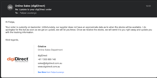 After sending the formal complaint letter to digidirect Brisbane about the three months delay, I waited for their response but no response at all. The next day my wife rang digidirect Brisbane and asked whether they have the item in stock and the guy instantly said to her that there is no stock and even Sony Australia doesn't have it in stock so we should wait 4-5 weeks more. After hung up the phone, I went to another camera shop and asked them whether they have the same lens in stock and the guy said to me they have plenty of them in stock. So I called Sony Australia whether they have the lens in stock and they said they also have plenty and can deliver it anywhere in Australia within 2 days!