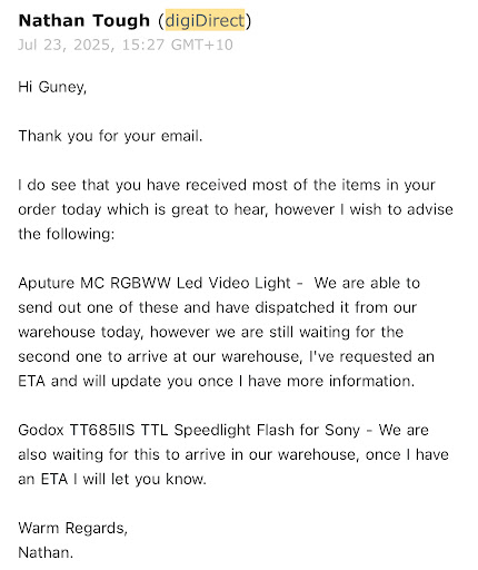 Honestly, every single time I deal with DigiDirect it hurts. I want to support local businesses and I prefer not to get things off Amazon, but there just aren't great alternatives. If the products are available at CameraPro, go there! It is a much better experience and if not just go in store, or buy off Amazon. At least then you know what you're getting and when...