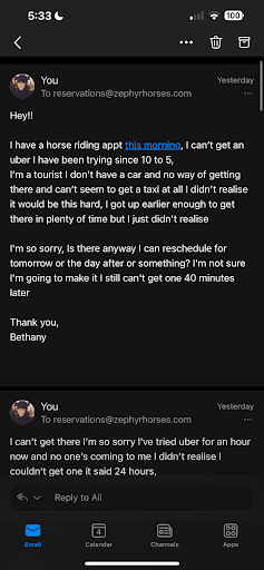 I emailed them and hope they would allow me to reschedule, they have 5 spots available for the day after, hoping they had some empathy for my situation, as a backpacker with little money, and a love for horses all I wanted to do was ride with these guys. They refused and quoted t&c’s to me saying as I hadn’t turned up, they will not re schedule my horse ride or provide me any sort of credit, they offered me a meer 10% off my next ride like I even have the money to boom with them again.
