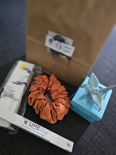 I did not intend to buy anything but heck, no regrets! I ended up with an origami crane incense holder, ume (perserverence) and spicy sweet incense, an upcycled kimono scrunchie and a key holder.