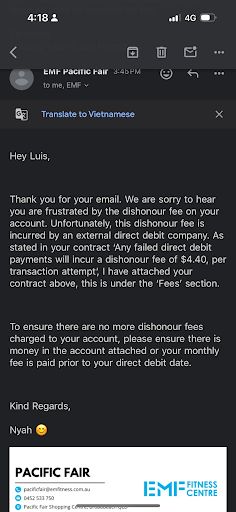 My mother, I and my older brother are members of EMF Pacific Fair, but every month there have been serious issues with the payment process. Despite the fact that we have the monthly payments on-time and successfully, my mother was still charged a dishonour fee. This is not the first time, but the 3rd and 4th time throughout the duration of our memberships.
