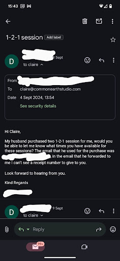 I purchased a 1-2-1 session for my wife as a first mother's day present in May. When I purchased the 1-2-1 session it was due to expire in 6 months (see attached email). This would be perfect as my wife was due to have our 2nd baby in early November so she would be able to have a lovely relaxing experience before going back into the trenches of newborn life. My wife and I tried multiple times to contact Claire via email, phone calls and visits to the studio to book the session as you can't do it online (see attached emails). We got no response from any of our communications. It was a very disappointing experience and I feel extremely sad that my wife didn't get to enjoy her first mother's day present. We received a text saying that the voucher was about to expire so we texted Claire again requesting a refund as my wife was about to give birth and there was no time to organise a session for her before the birth of our second child. I also want to get her a replacement mother's day gift. Immediately after we requested the refund we finally got our first communication from Claire. Claire texted saying that the 1-2-1 sessions are not refundable and told us that she could book in a session. My wife was about to give birth and no longer felt that she would be able to relax and enjoy the experience after the very poor customer service we had received. While we understand that the session is not refundable we feel that as we had tried on multiple times and ways to book in and had not received an answer Claire would not be so unethical as to refuse to fund the money for a service that she...